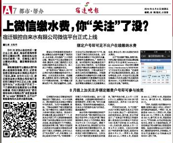 聯(lián)合水務江蘇宿遷市銀控自來水有限公司微信平臺正式上線