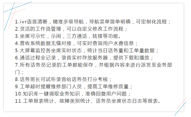 匯尼呼叫中心通過使用最新的數(shù)字處理技術(shù),以及軟硬件技術(shù)的結(jié)合將電信網(wǎng)絡(luò)與計算機網(wǎng)絡(luò)緊密地融合在一起,使語音業(yè)務(wù)與數(shù)據(jù)業(yè)務(wù)融為一體,從而大大地提高了自來水公司服務(wù)質(zhì)量。市民任何與用水相關(guān)的問題,如水量水費自助查詢,咨詢,投訴,報障、報修均可撥打客服熱線得到供水公司提供的人工座席、計算機自動語音服務(wù)。確保在第一時間趕到現(xiàn)場排除障,減少損失,提高了效率,改善了服務(wù)質(zhì)量。此外,建立客戶服務(wù)中心統(tǒng)的對外服務(wù)窗口,提成公司企業(yè)形象。