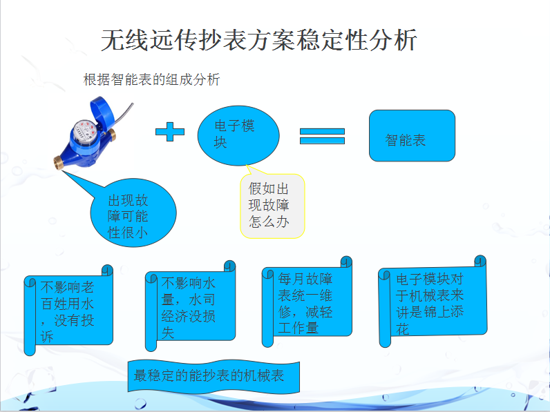 機(jī)械表很穩(wěn)定,在其基礎(chǔ)上加一個電子裝置就成為智能表,根據(jù)上面分析,即使電子裝置出故障,機(jī)械表正常使用不會干擾居民用水,也不會引起投訴,之后水司可以每個月對個別故障表進(jìn)行統(tǒng)一維修或更換, 最主要的是,水司維護(hù)不需要及時性,如果是卡表,閥門出現(xiàn)故障用戶不能用水,必須2小時之內(nèi)上門解決,這樣為了一戶表,維護(hù)成本高,費用大,效率低,對于用戶覺得影響個人用水,對于水司來講,工程部效率低下,維護(hù)壓力太大。